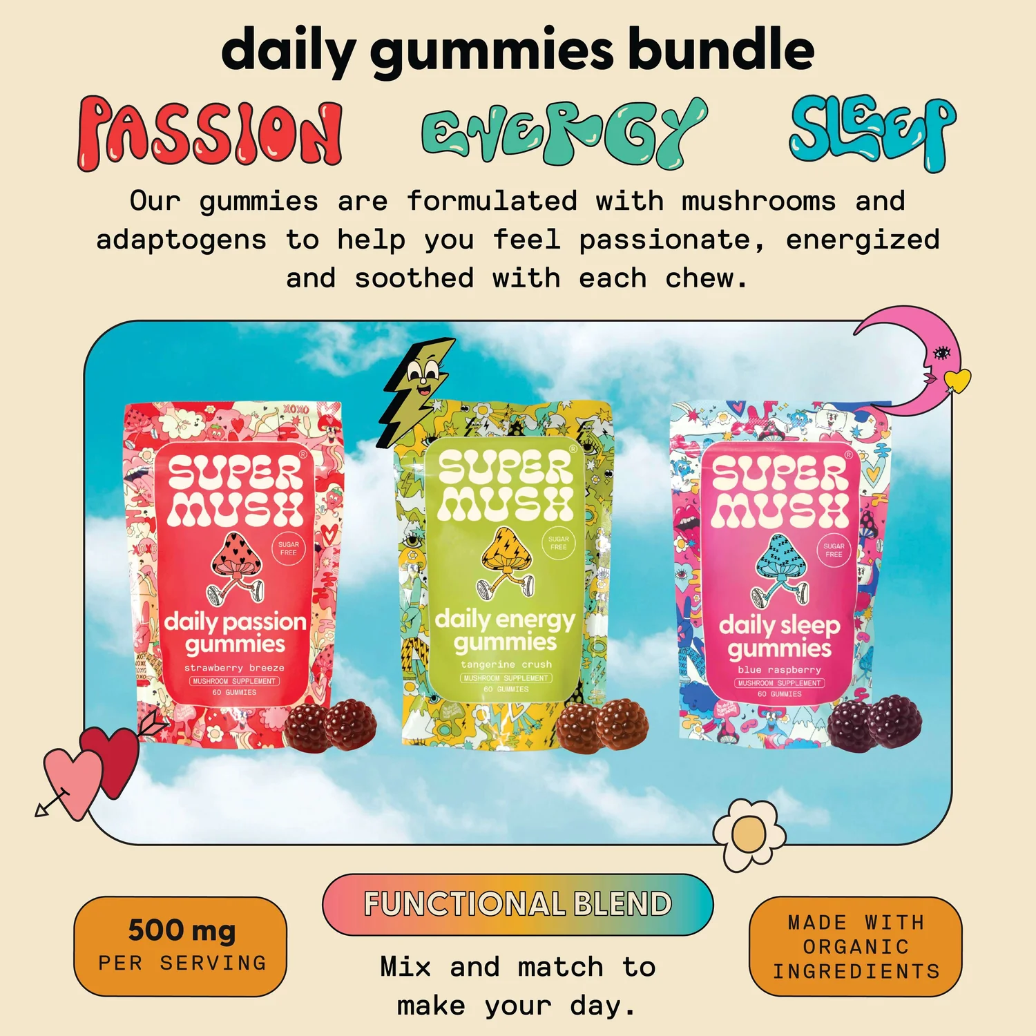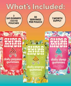 The SuperMush Daily Gummies Bundle + Free Welcome Kit is a best-selling, value-packed wellness set designed to support your daily health and vital balance. Combining three distinct mushroom-infused gummy formulas—Energy, Passion, and Sleep—this bundle offers a comprehensive daily routine for energy, vitality, and restful sleep—all backed by functional mushrooms and adaptogens. Featured at a discounted price with extra bonuses, it’s a total wellness experience in a box.