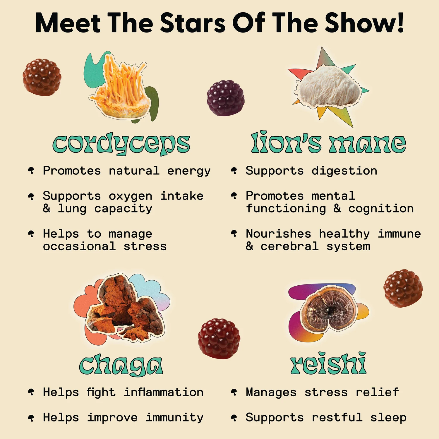 - Premium, Clean Ingredients: Uses only 100% fruiting-body mushrooms combined with adaptogens—no fillers or sugar—even better than many other gummy supplements.