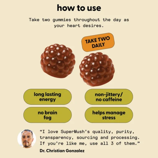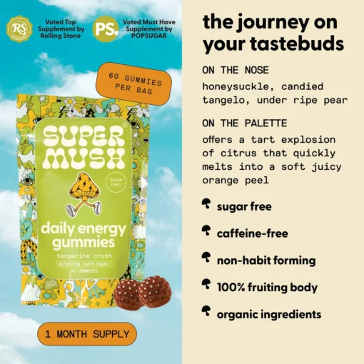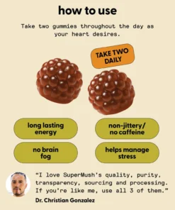 If you’re tired of relying on coffee or artificial energy drinks, the SuperMush Daily Energy Gummies offer a smarter solution. Backed by the power of cordyceps mushrooms, green tea, and adaptogens, they provide sustained energy, mental clarity, and physical performance support in a delicious gummy form.